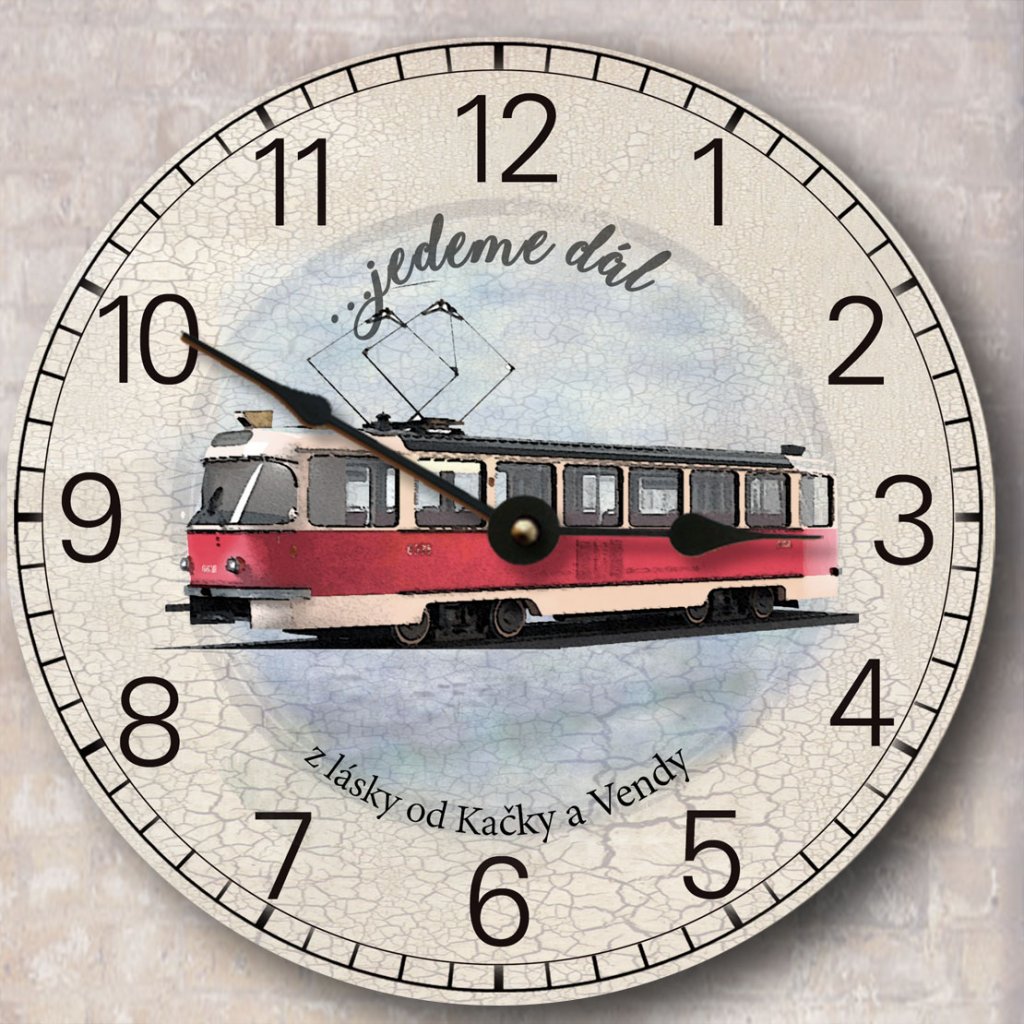 Na hodinách je nápis: ...jedeme dál a věnování. Oba nápisy je možné změnit na přání. Změnu pište do pozámky k objednávce.