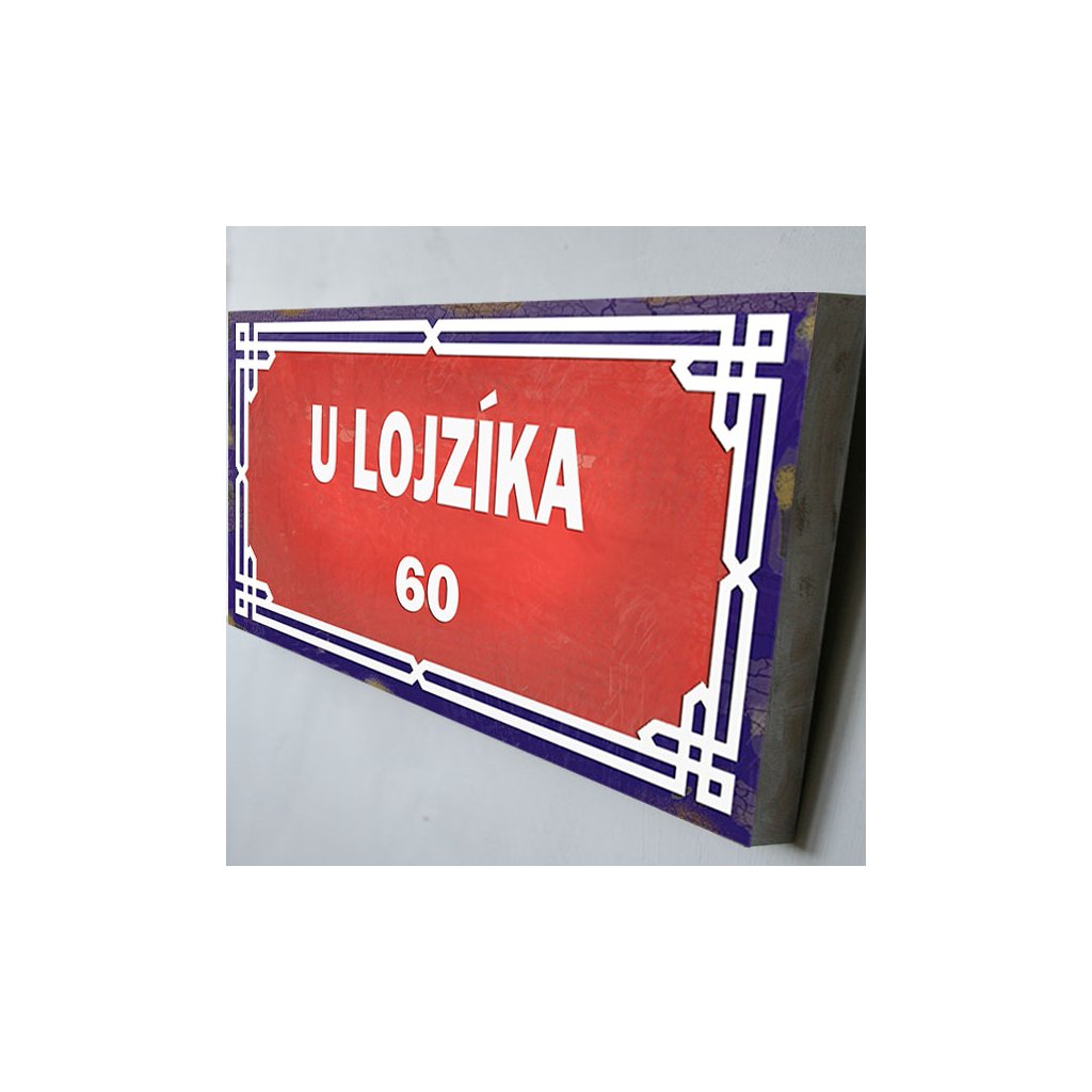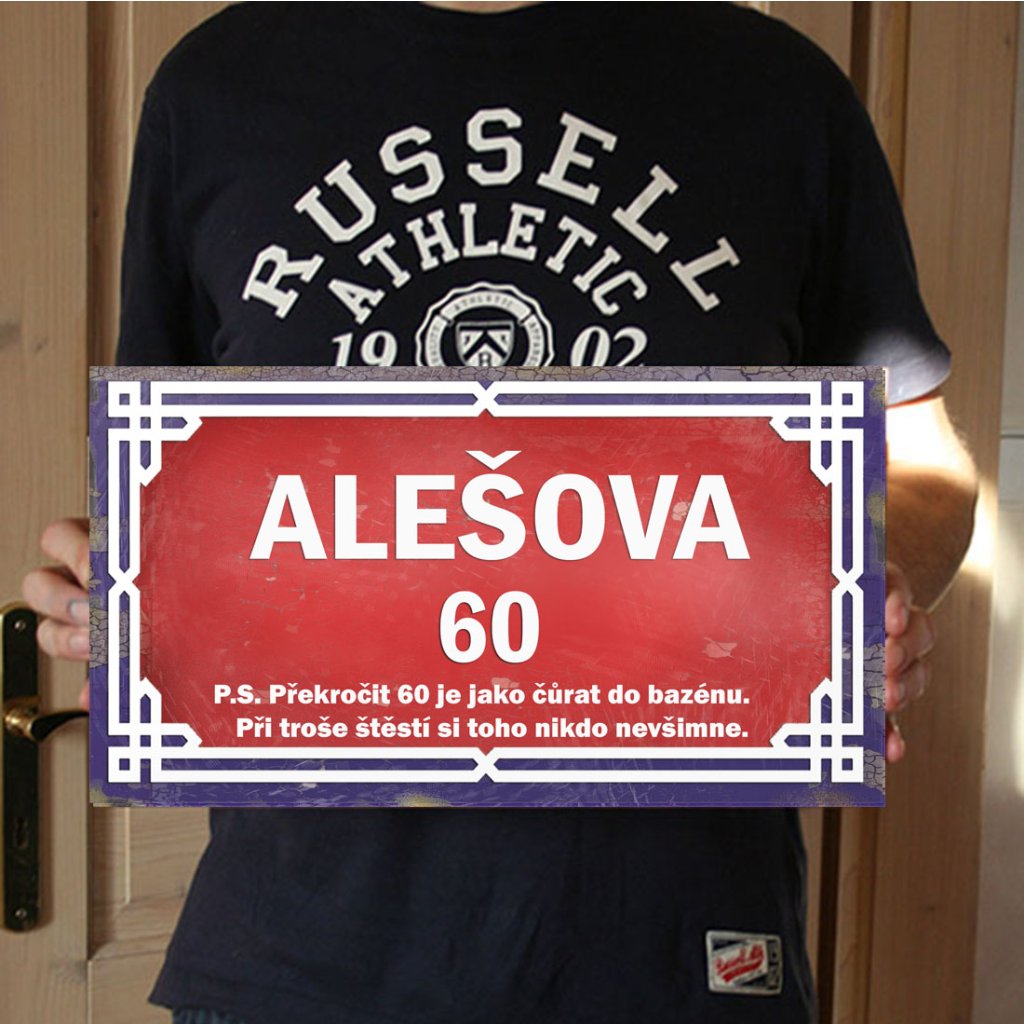 Originální cedule na masivní dřevěné směsné desce napodobující pouliční značení se jménem a číslem oslavence a vtipným P.S.