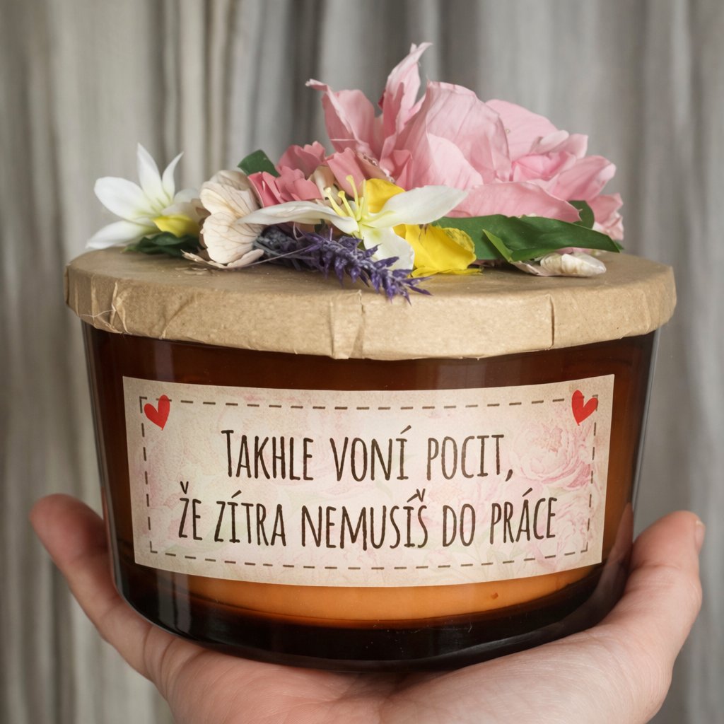Na svíčce je vtipný nápis TAKHLE VONÍ POCIT, ŽE ZÍTRA NEMUSÍŠ DO PRÁCE