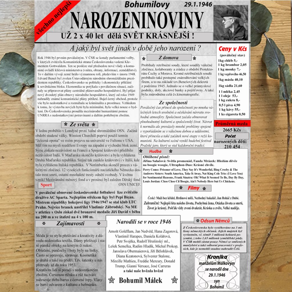 Noviny dále obsahují seznam osobností ze světa i České republiky, které se narodili v daném roce a také pro pobavení autentické inzeráty z daného roku, které nejlépe přiblíží rok narození oslavence.