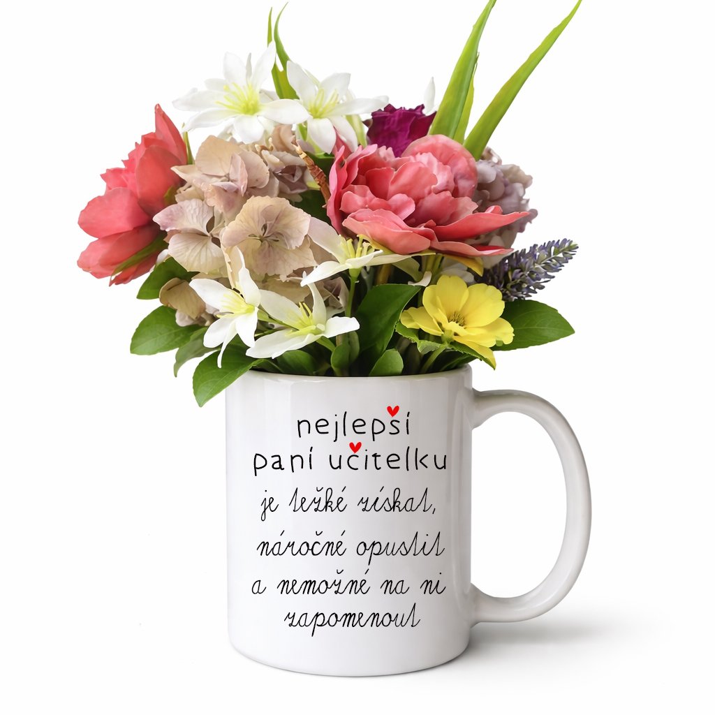 Hrnek jako dárek a květina pro paní učitelku