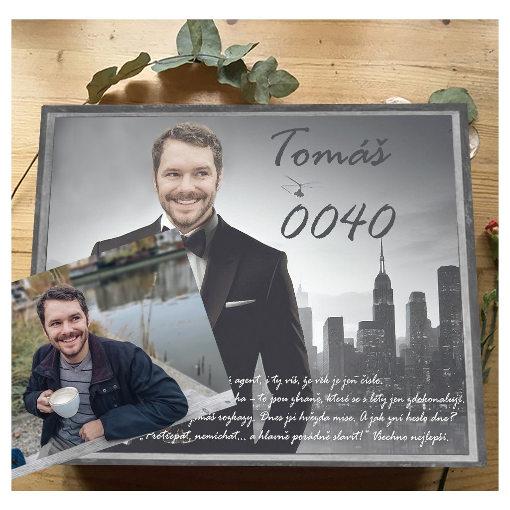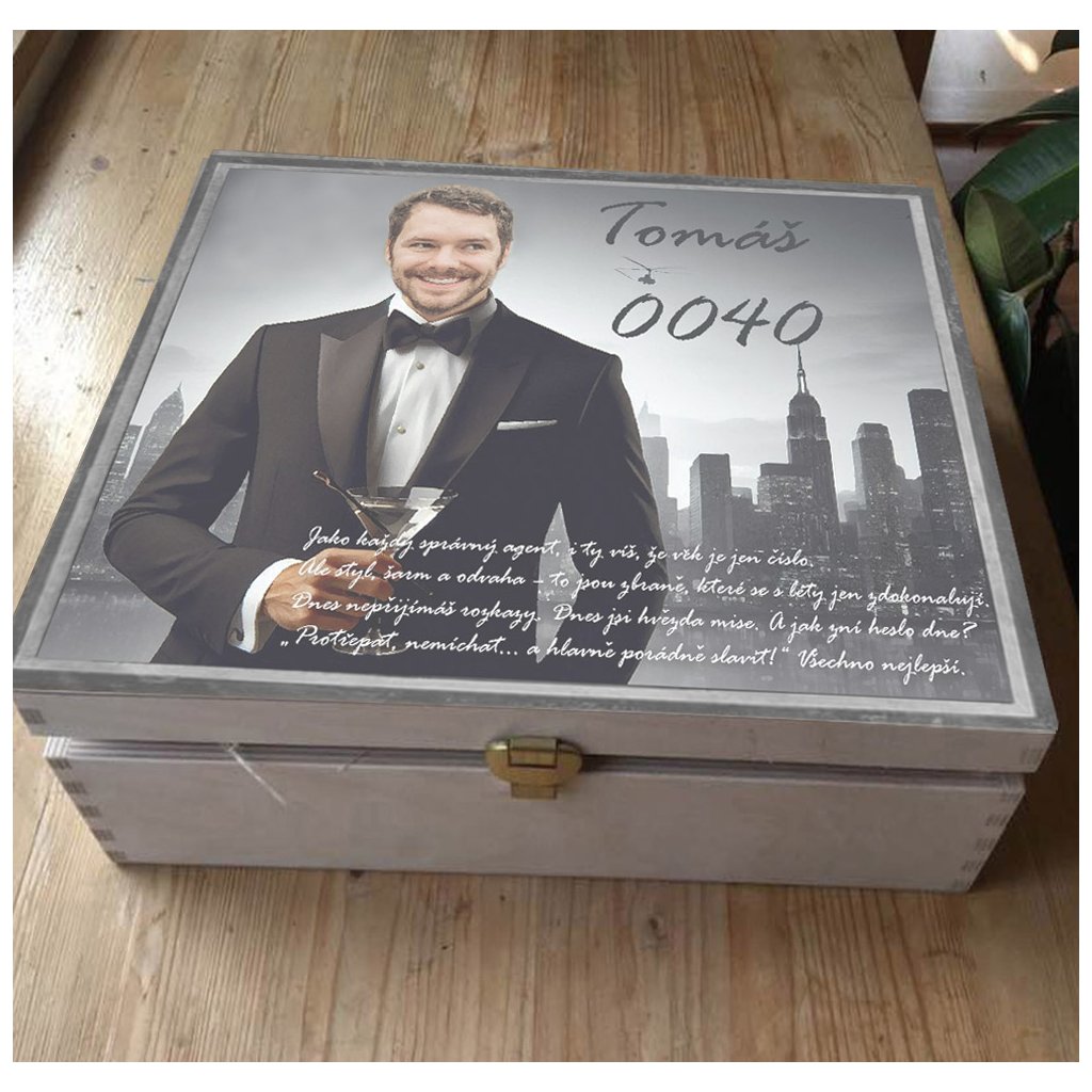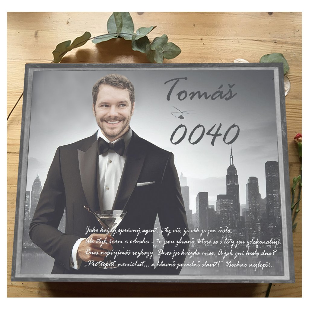 Máme pro vás skvělý tip. Pošlete nám fotografii oslavence a my vám z ní vytvoříme obrázek Jamese Bonda s fotkou vašeho oslavence, který pak natiskneme na velký dřevěný box, krabici do které můžete dát třeba tři vína, jiný alkohol nebo potraviny, sladkosti nebo třeba lístky na fotbal.