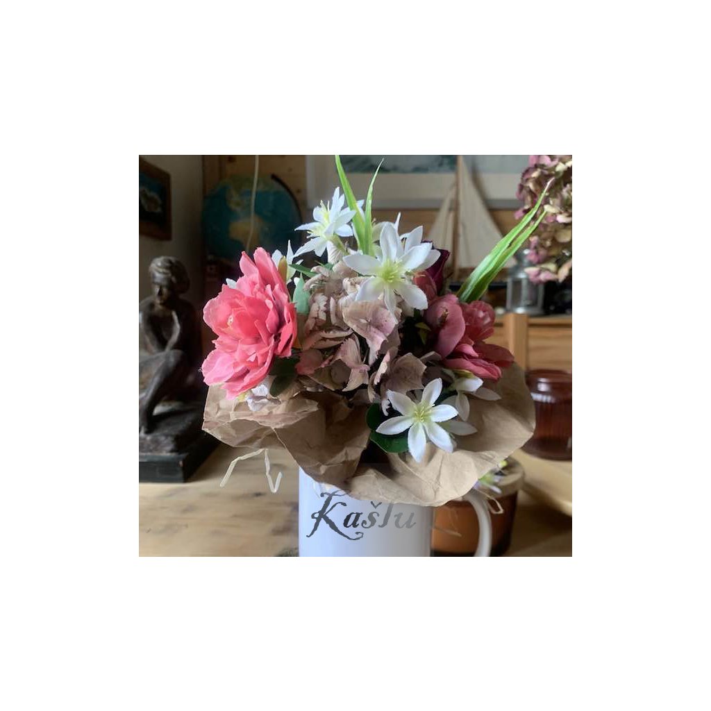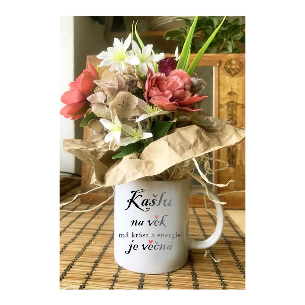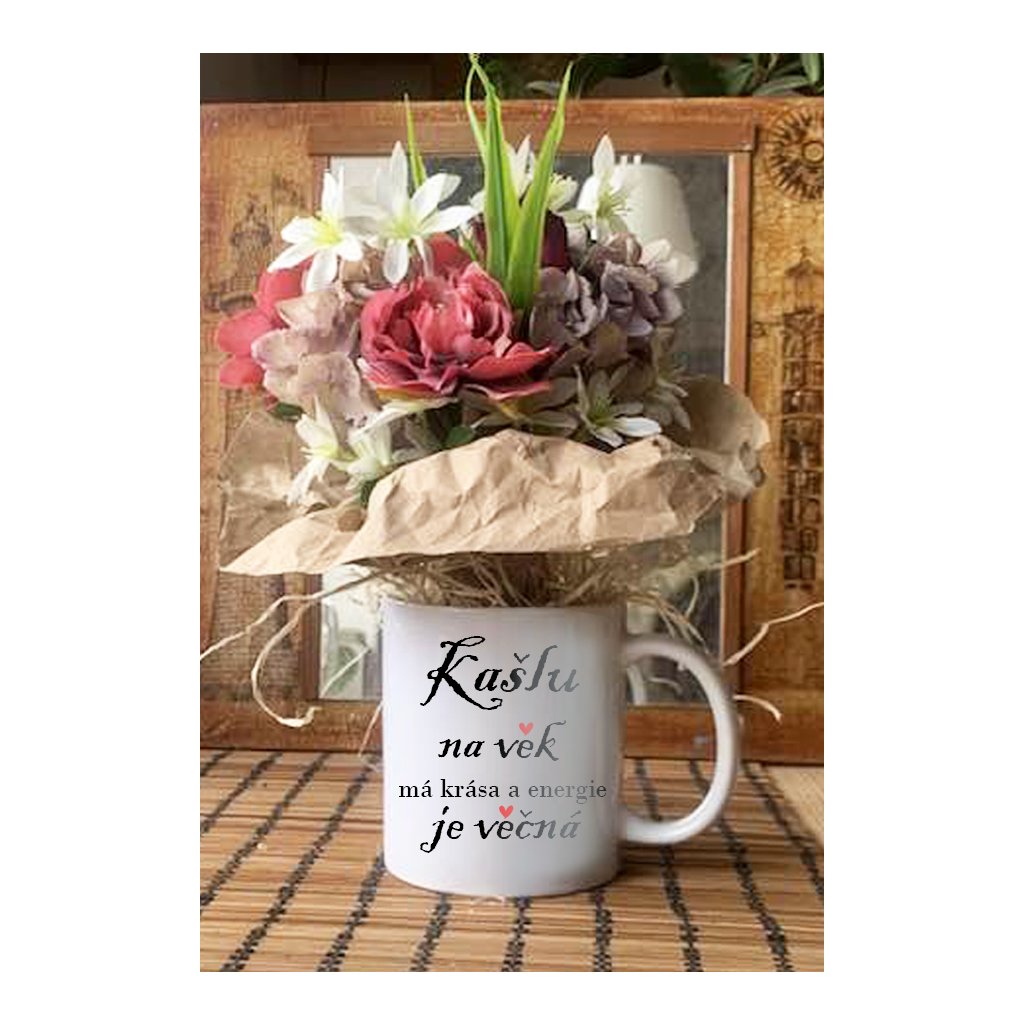 Hrníček je bílý klasický s potiskem o objemu 300 ml, kytka je svázaná z umělých a sušených květin do milého aranžma.